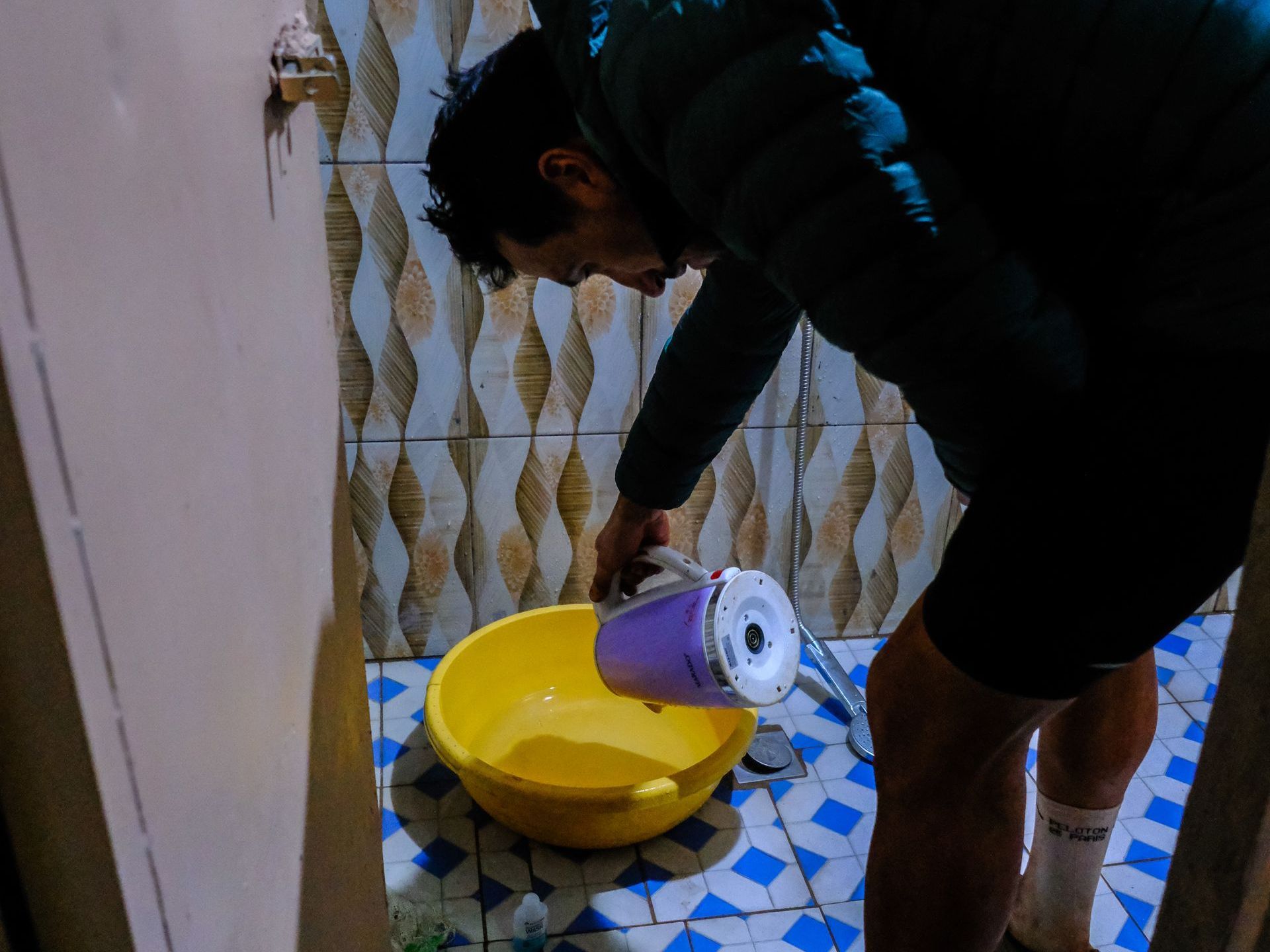 Na de eerste 300 km besloten we een plek te zoeken om enkele uurtjes uit te rusten. We kwamen terecht in een dorpje dat zelfs niet op de kaart terug te vinden was, en vroegen een local of hij een plek om te slapen wist. Hij begeleidde ons naar een rumoerig café, waar we langs poorten en gangetjes op een rustige patio terecht kwamen met twee gastenkamers. Meteen ook de enige slaapplek waar we een ‘warme douche’ konden nemen. Vijftien minuten later was diezelfde man terug met twee grote borden rijst, bonen, gegrilde groenten en aardappelen en enkele flesjes Fanta.