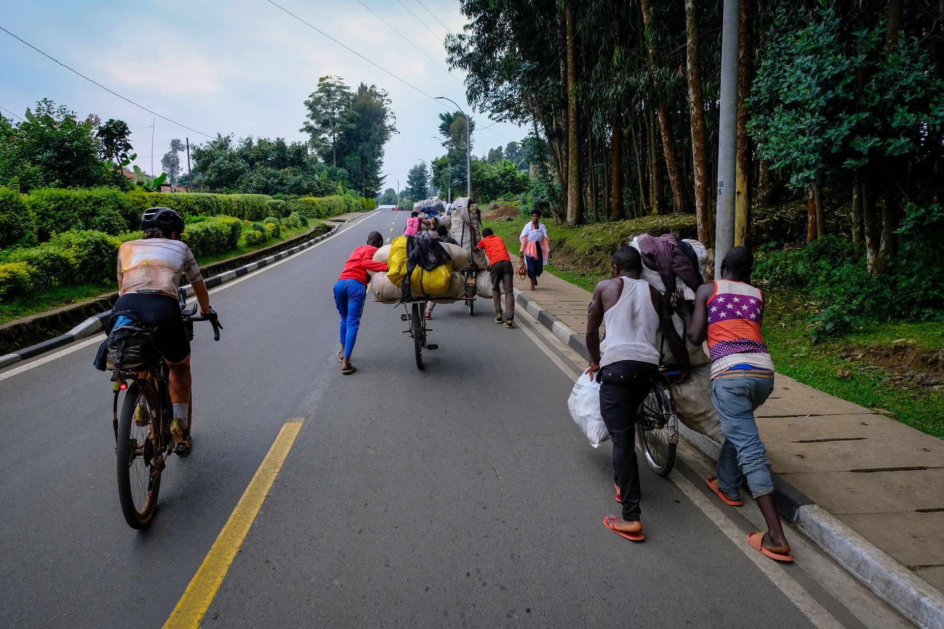 Er is niets te heet of te zwaar of het wordt met de fiets getransporteerd. Je ziet overal fietsen volgeladen met mais, thee, bananen of bakken bananenbier, en ook velo taxi’s zijn erg populair. Bergop betekent dit vaak duwen, maar bergaf racen de Rwandezen tegen 60 km/u, al remmend met de voeten, de berg af.